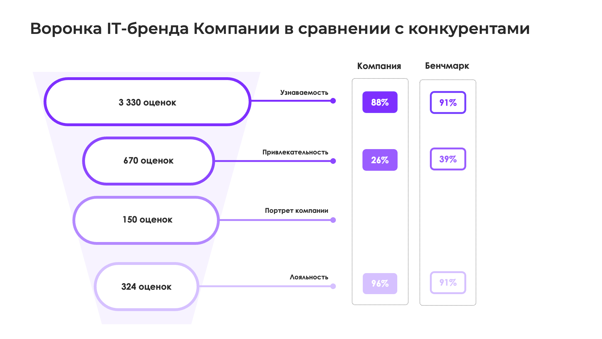 Мы «прогоним» каждый бренд через эту воронку, определим конверсию и уровень здоровья IT‑бренда работодателя