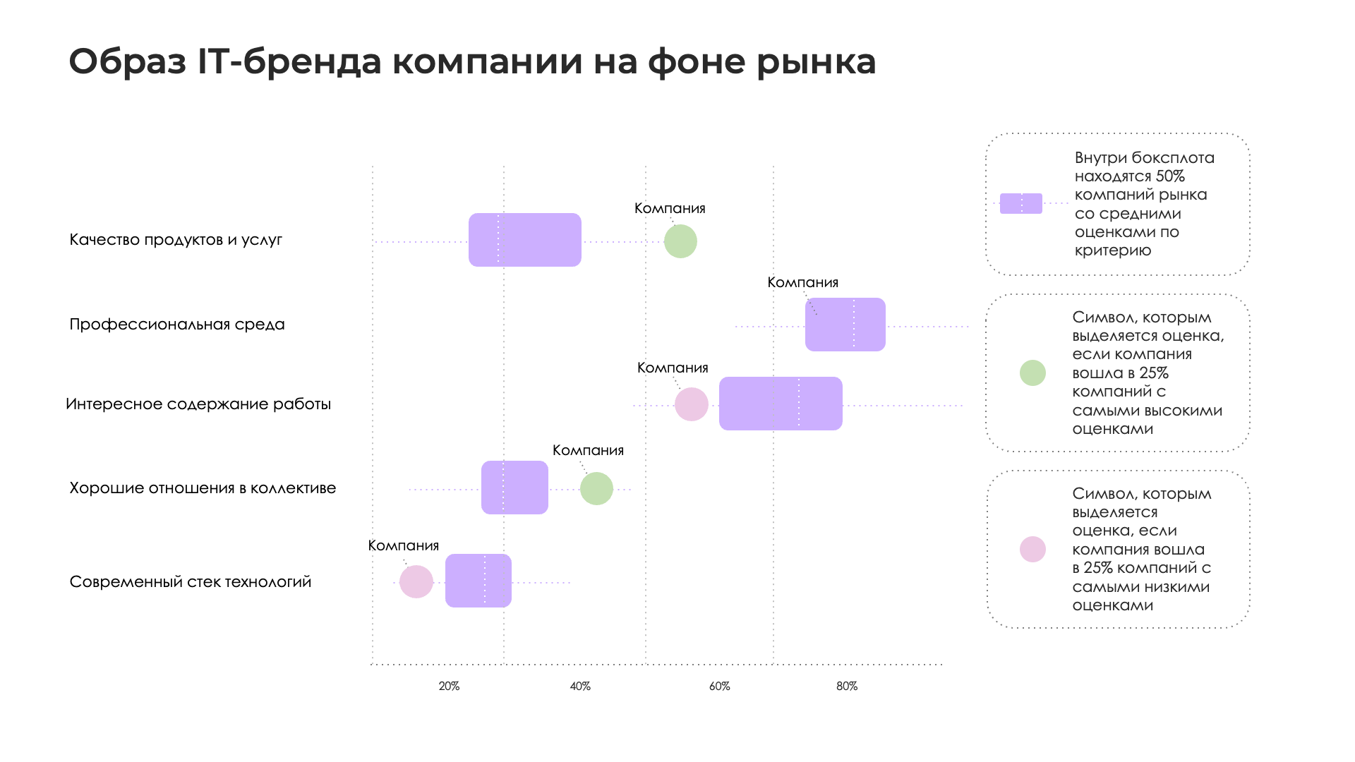 Если компания не работает над своим IT-брендом работодателя, он формируется стихийно. Отчет даст возможность увидеть, как соискатели и сотрудники воспринимают вашу компанию на данный момент.